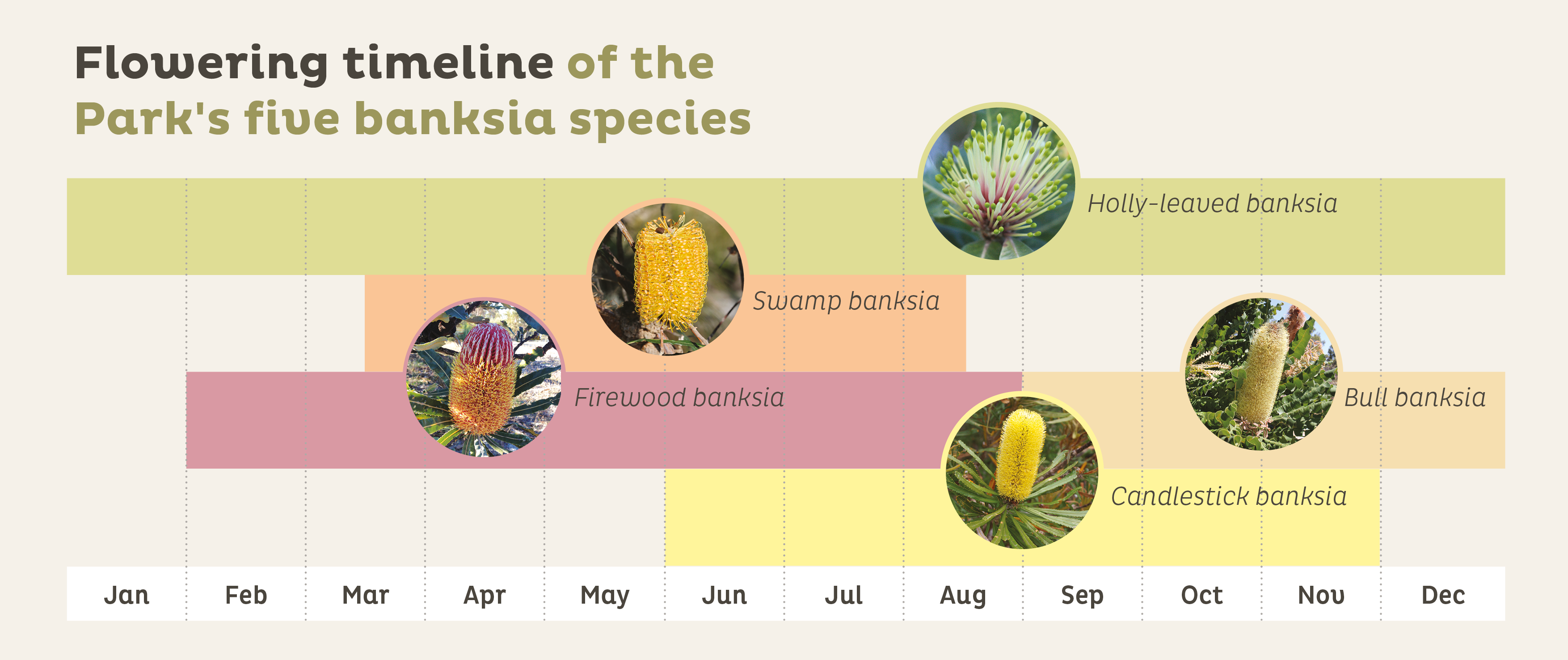 There are five canopy banksia species found within the bounds of Whiteman Park, whose flowering season span the entire year.
